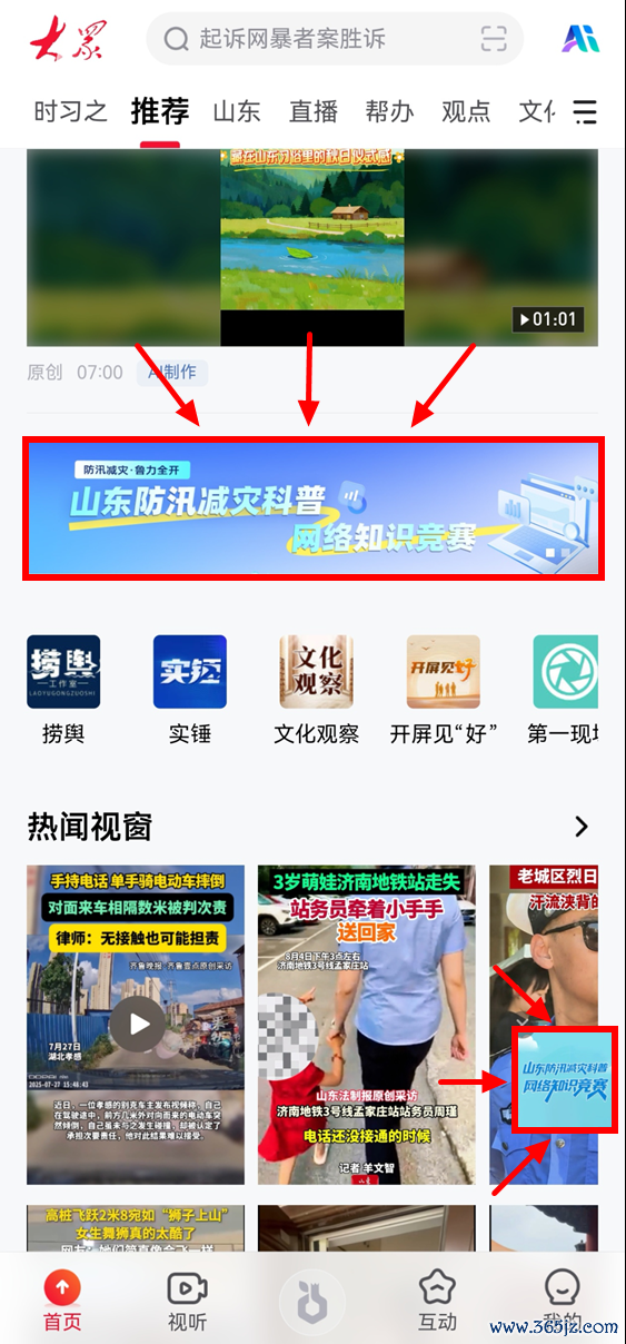 ●方式一:怒放世界新闻客户端,在首页找到“山东防汛减灾科普网罗知识竞赛”算作图片,点击即可参与答题。