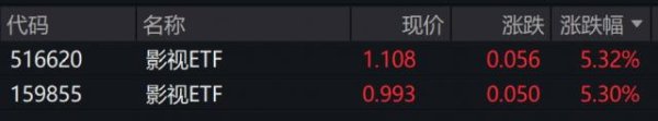 受重仓股高涨影响,追踪中证影视主题指数的影视 ETF 涨超 5%。